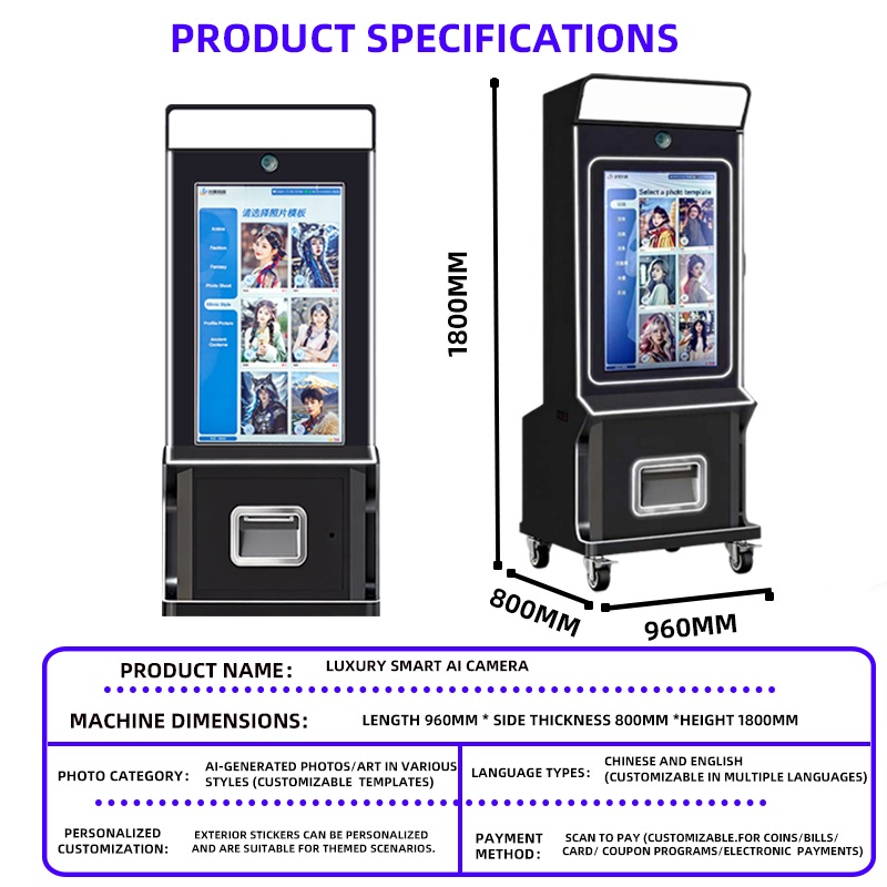 Product functions:It can capture various styles and has a large amount of materials. Customizable LOGO, custom UI, borders, colors, stickers, countdown, etc. are available, facilitating diversified management by merchants. It can take photos in 5 seconds. There's no need to re-take them. Once the photo is taken, it can be printed immediately, or you can obtain an electronic version (only paying users can scan the code to obtain the electronic version, which greatly protects user privacy)..